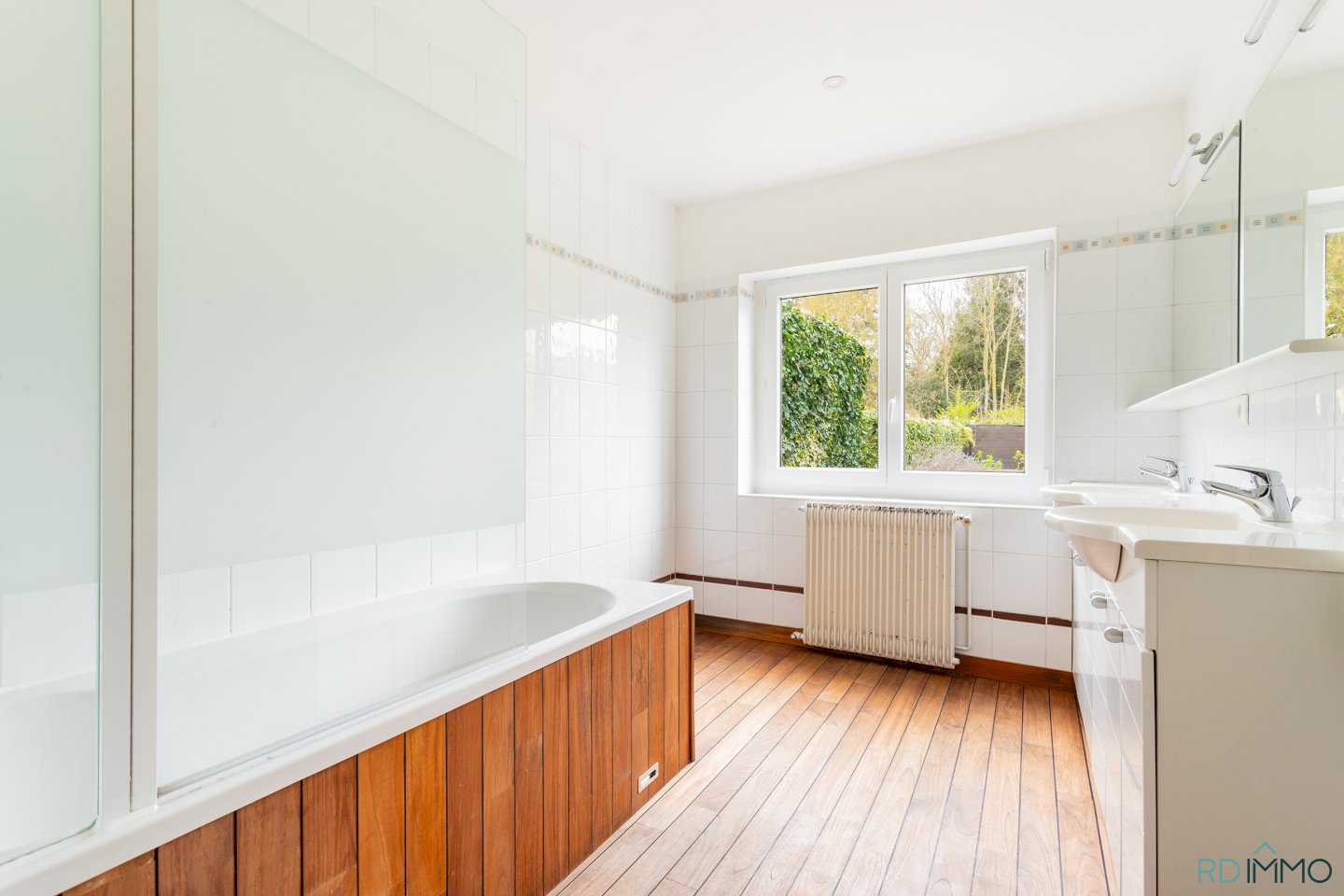 Ce niveau offre également une grande salle de bain avec double vasque, une buanderie, un WC indépendant ainsi qu’un garage attenant.